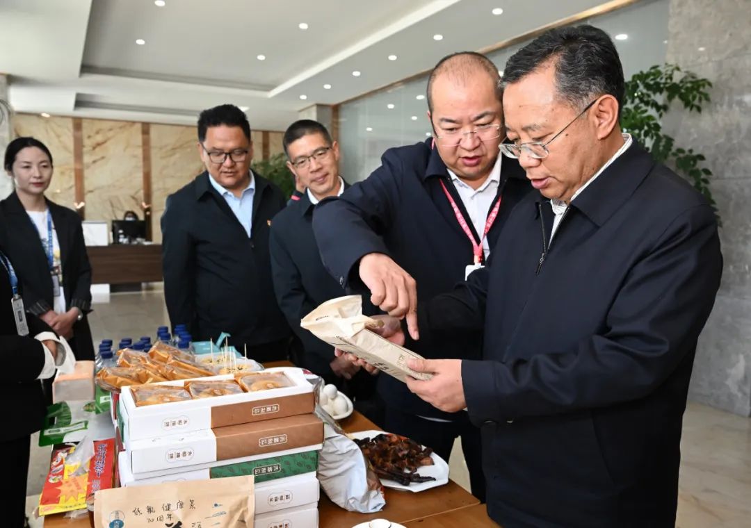 圖為普布頓珠在市凈土產業(yè)投資開發(fā)有限公司仔細查看各類產品,詳細了解公司投資運營管理有關情況。記者 平措旺堆 攝