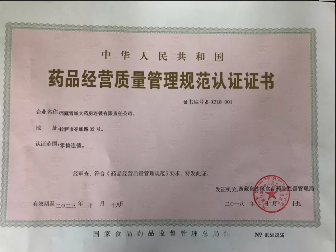 2018年10月19日,經(jīng)過從2017年12月開始歷時10個月的申報材料遞交、初審、認證檢查、符合檢查,公示取證等程序,西藏雪域大藥房連鎖有限責(zé)任公司正式獲批西藏自治區(qū)食品藥品監(jiān)督管理局頒發(fā)的第一張連鎖認證資質(zhì),即:《藥品經(jīng)營質(zhì)量管理規(guī)范認證證書》(簡稱:GSP證書)以及《藥品經(jīng)營許可證》。