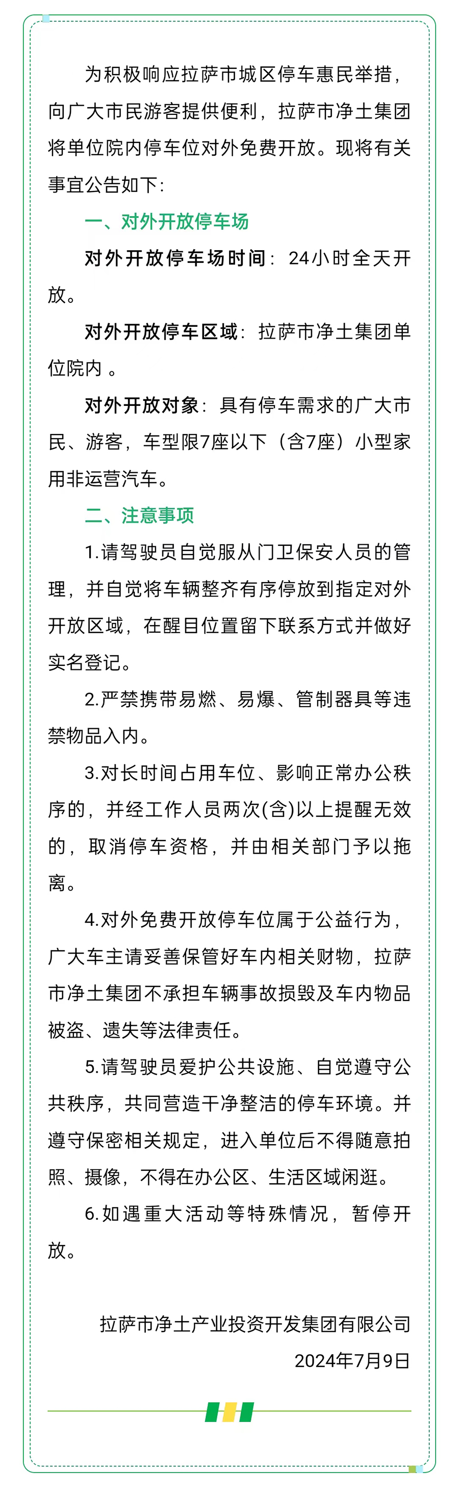 拉薩市凈土集團關(guān)于免費對外開放停車場的公告