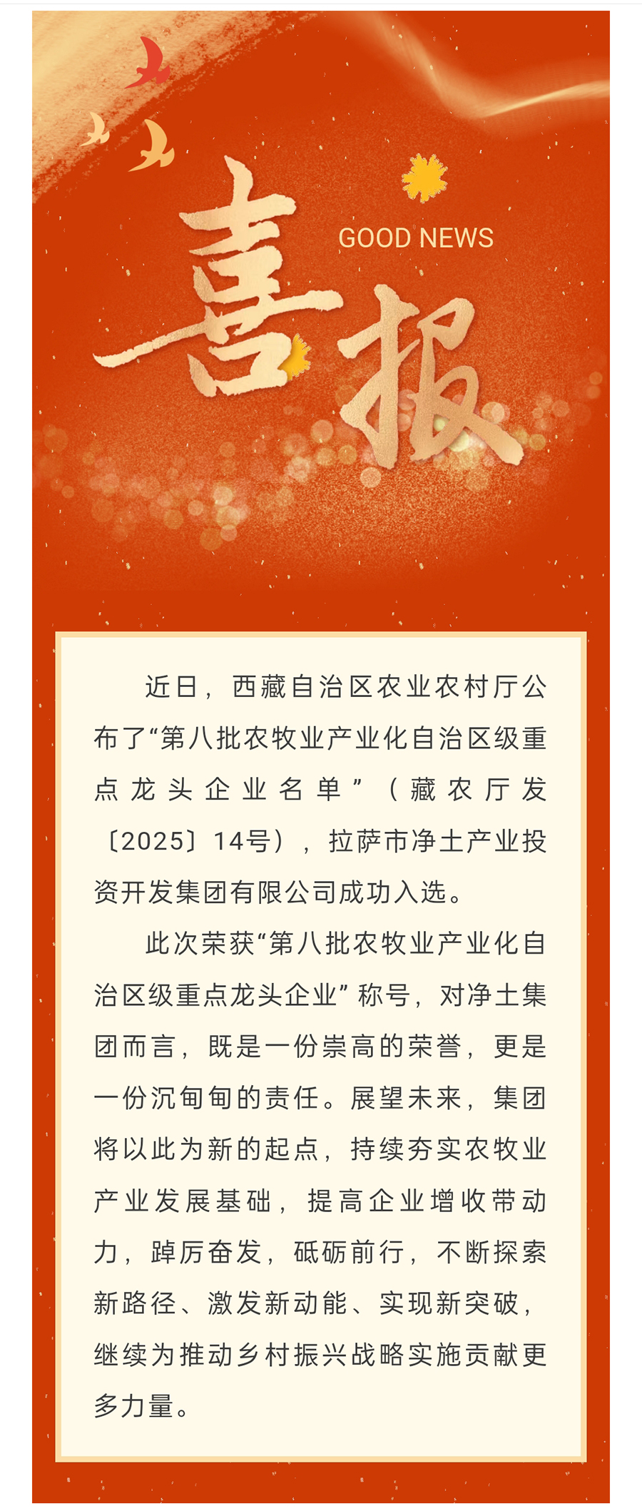 喜報(bào)!拉薩市凈土產(chǎn)業(yè)投資開(kāi)發(fā)集團(tuán)有限公司入選第八批農(nóng)牧業(yè)產(chǎn)業(yè)化自治區(qū)級(jí)重點(diǎn)龍頭企業(yè)名單