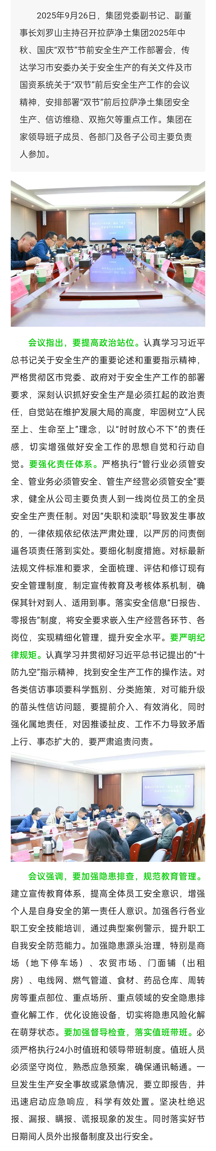 筑牢安全防線 護(hù)航雙節(jié)祥和(拉薩凈土集團(tuán)召開2025年中秋、國慶“雙節(jié)”節(jié)前安全生產(chǎn)工作部署會)