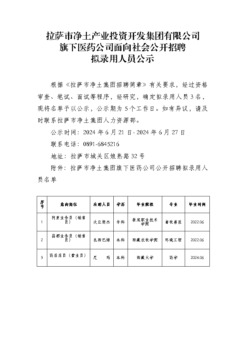 拉薩市凈土產(chǎn)業(yè)投資開發(fā)集團(tuán)有限公司旗下醫(yī)藥公司面向社會(huì)公開招聘擬錄用人員公示