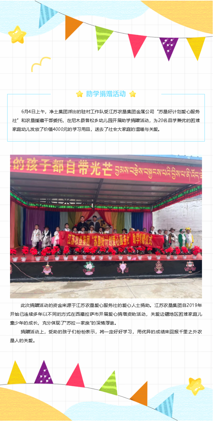市凈土集團受援單位江蘇農墾集團“蘇墾好計劃愛心服務社”在普松鄉(xiāng)幼兒園開展助學捐贈活動
